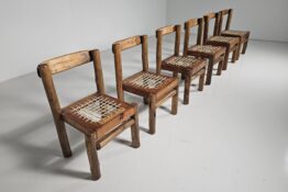 Set of 6 Solid pine wood and leather Brutalist Dining Chairs, Belgium, 1970s