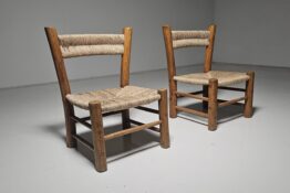 French Rustic Pair of Low Chairs in Elm Wood and Straw, 1960s