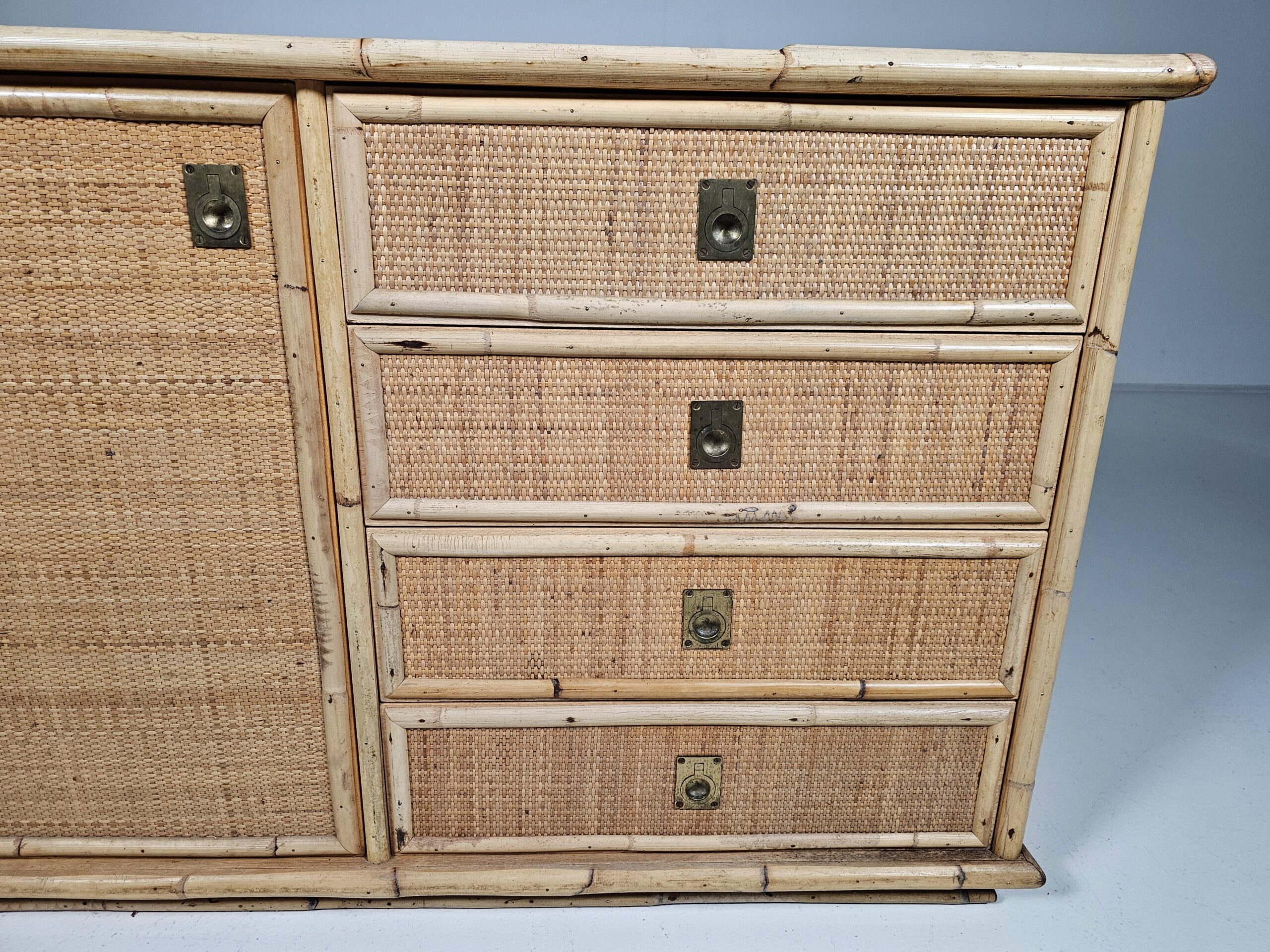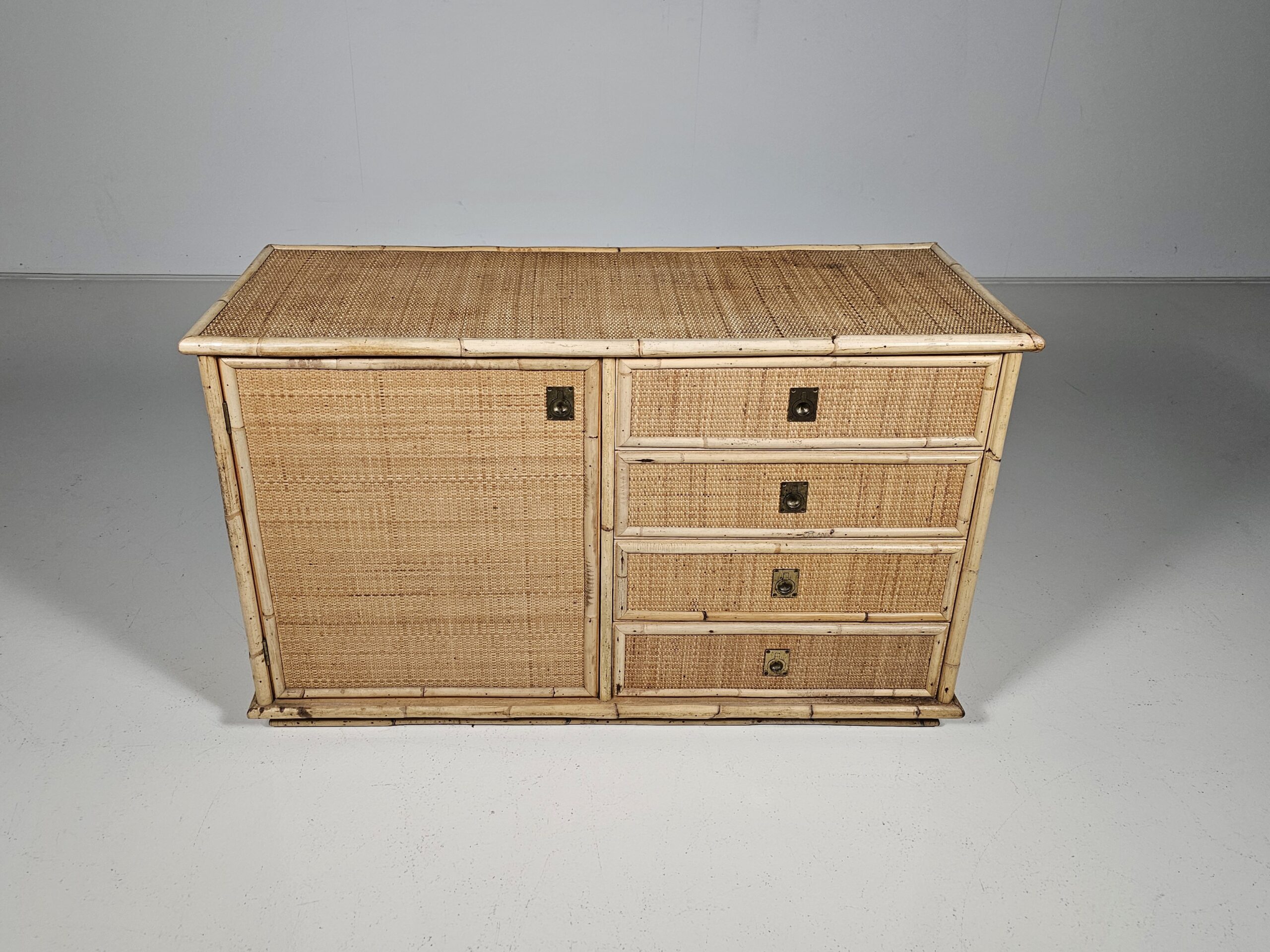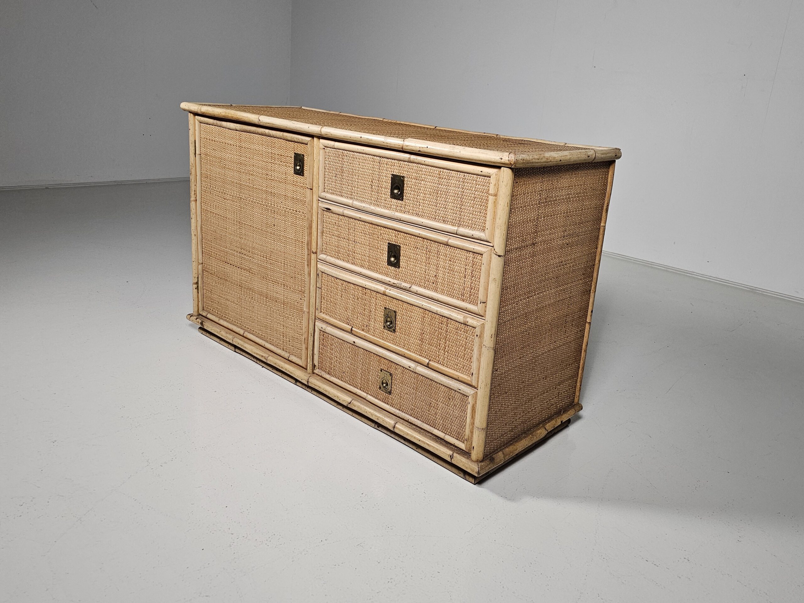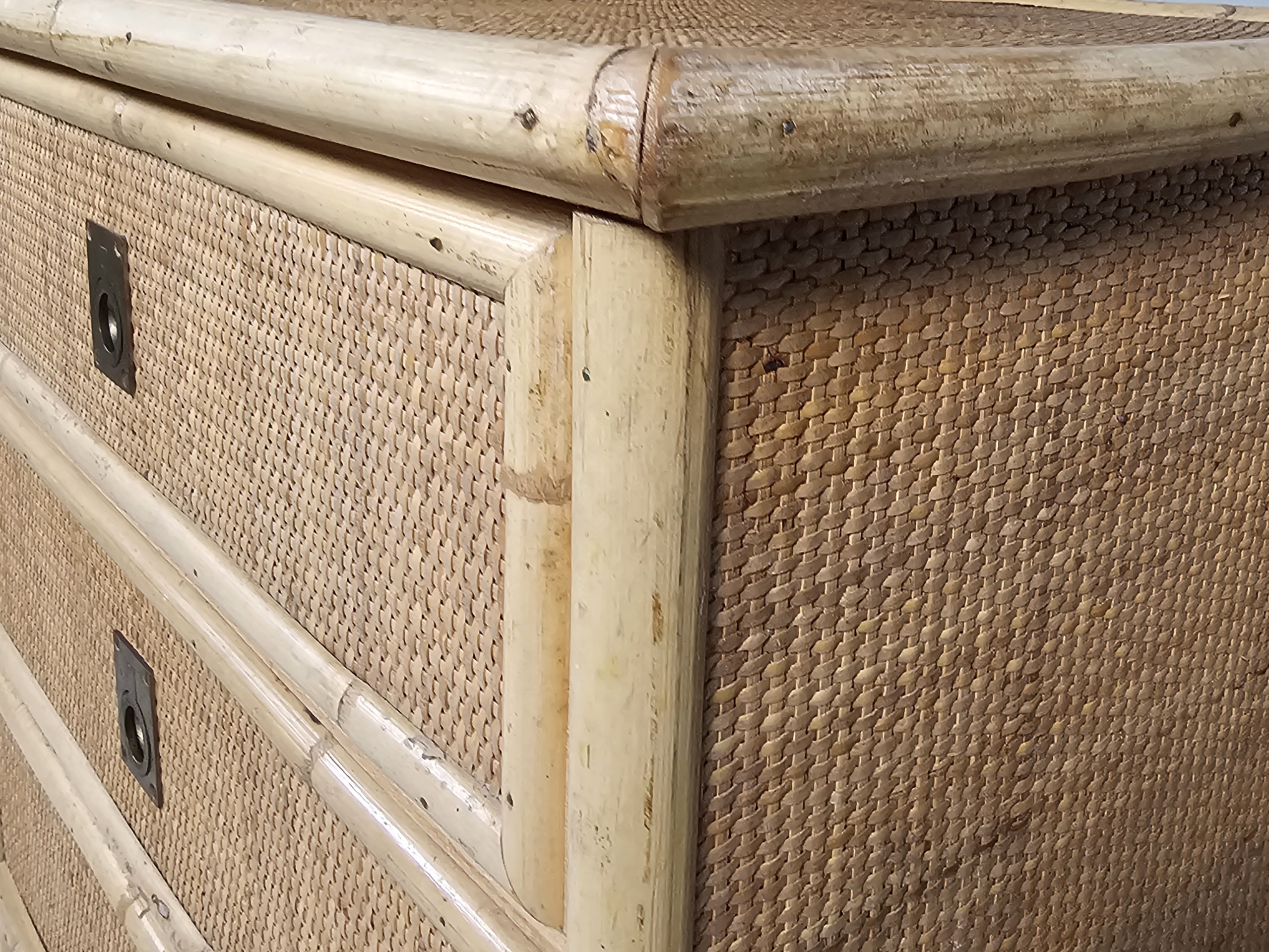 Nice mix of bamboo, rattan raffia wicker and brass handle commode by the manufacturer Dal Vera.
