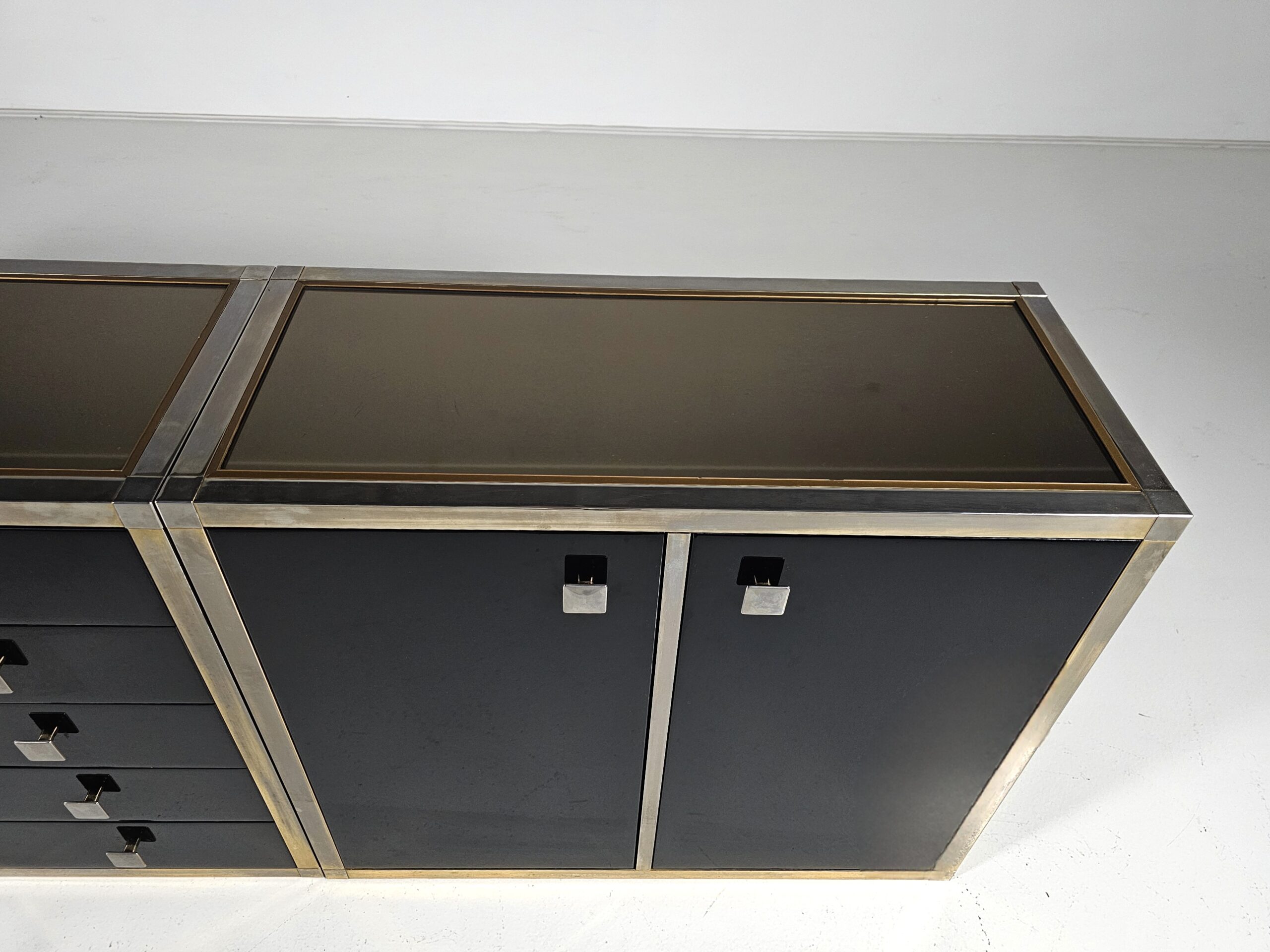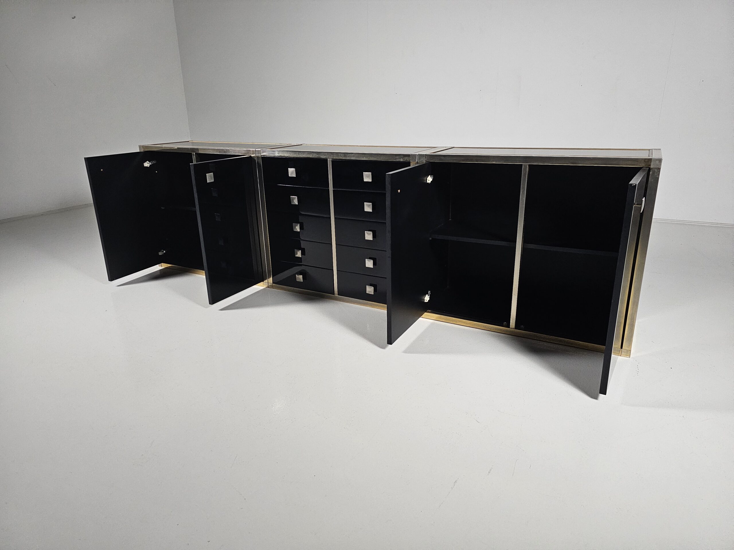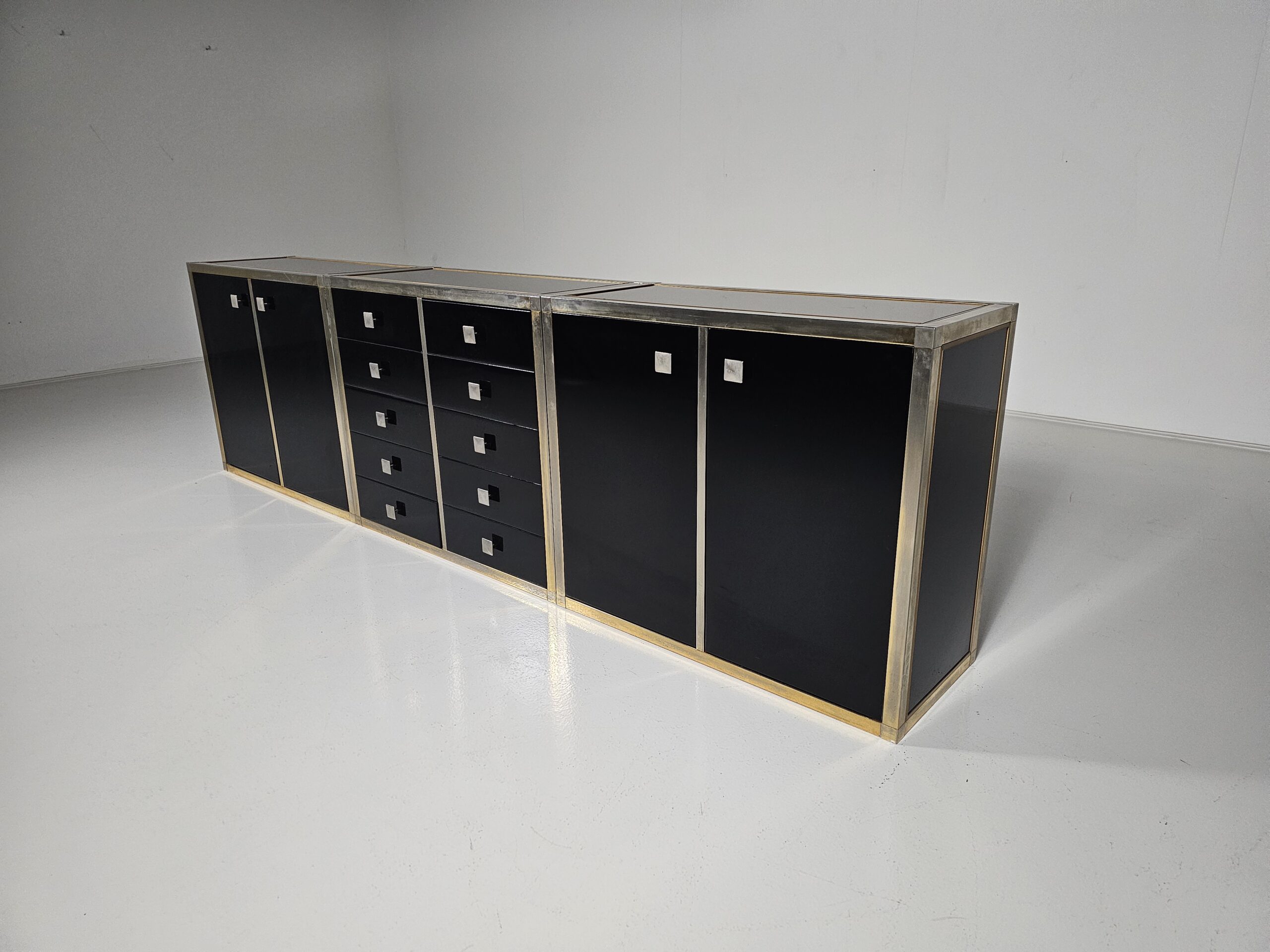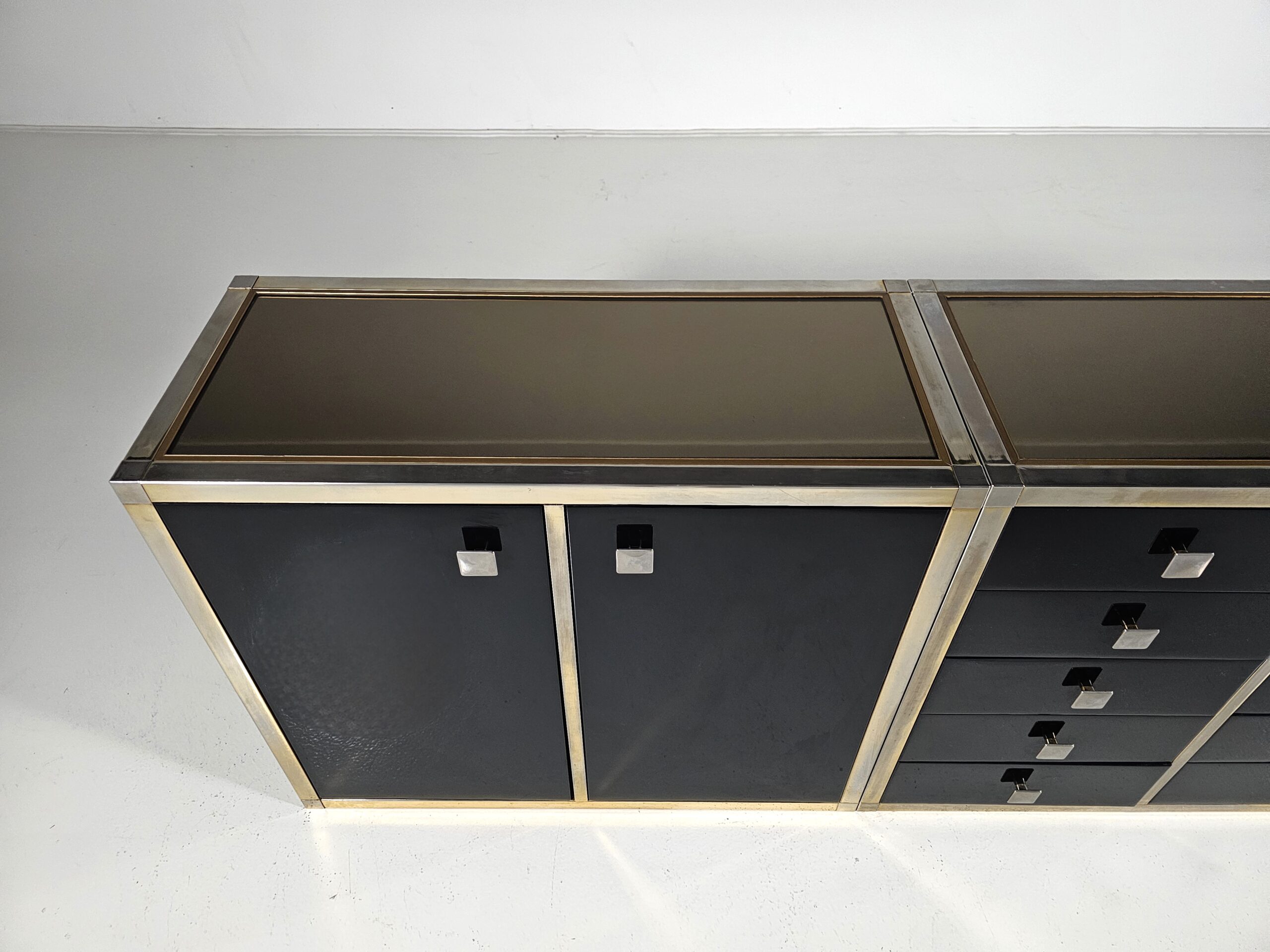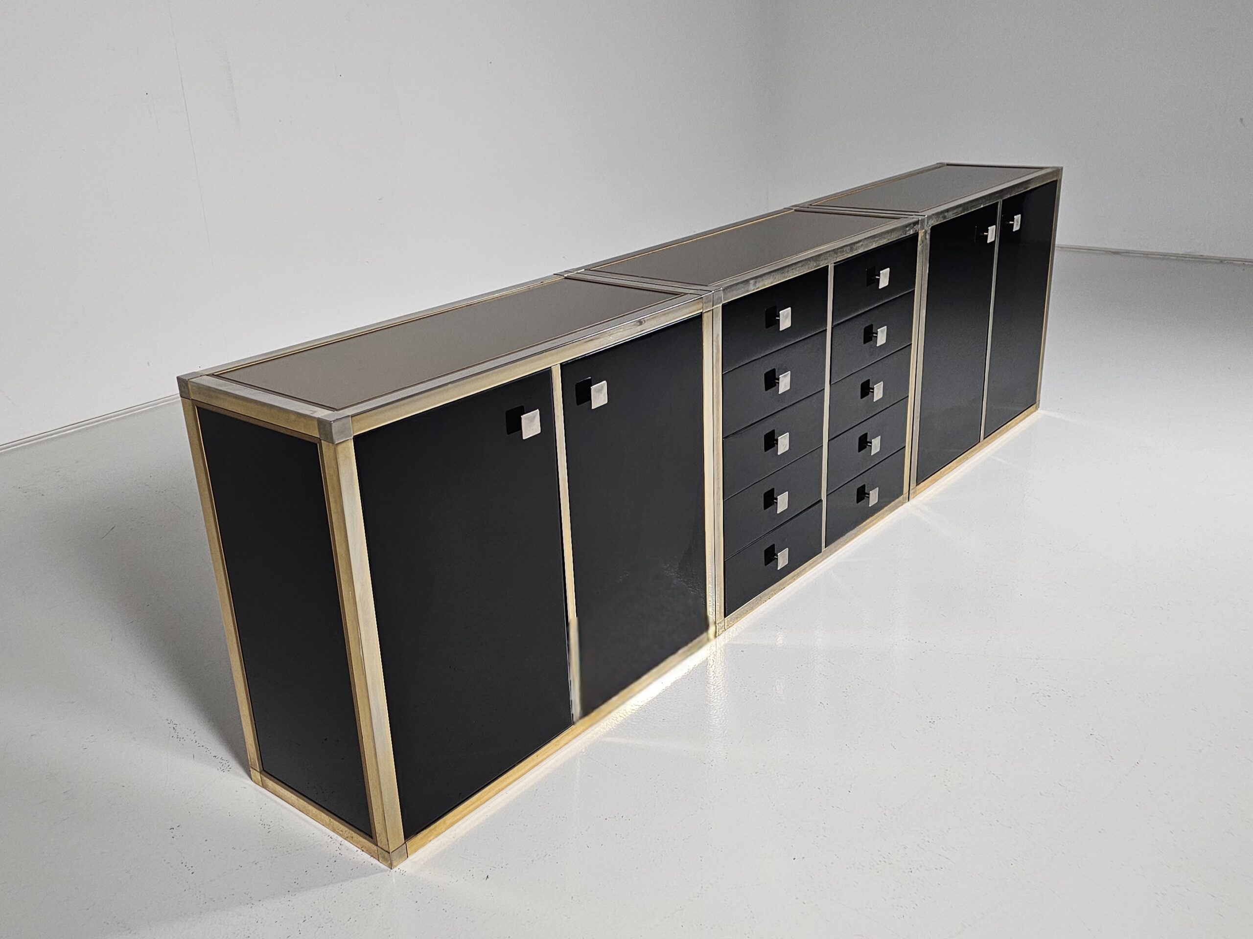 Stunning sideboard designed by Renato Zevi in the 1970s. It can also be separated to make smaller cabinets and a chest of drawers. Each element has a brass framing, black laminated panels, fronts, and opal glass tops. The handles and hinges are made of brass/chrome.