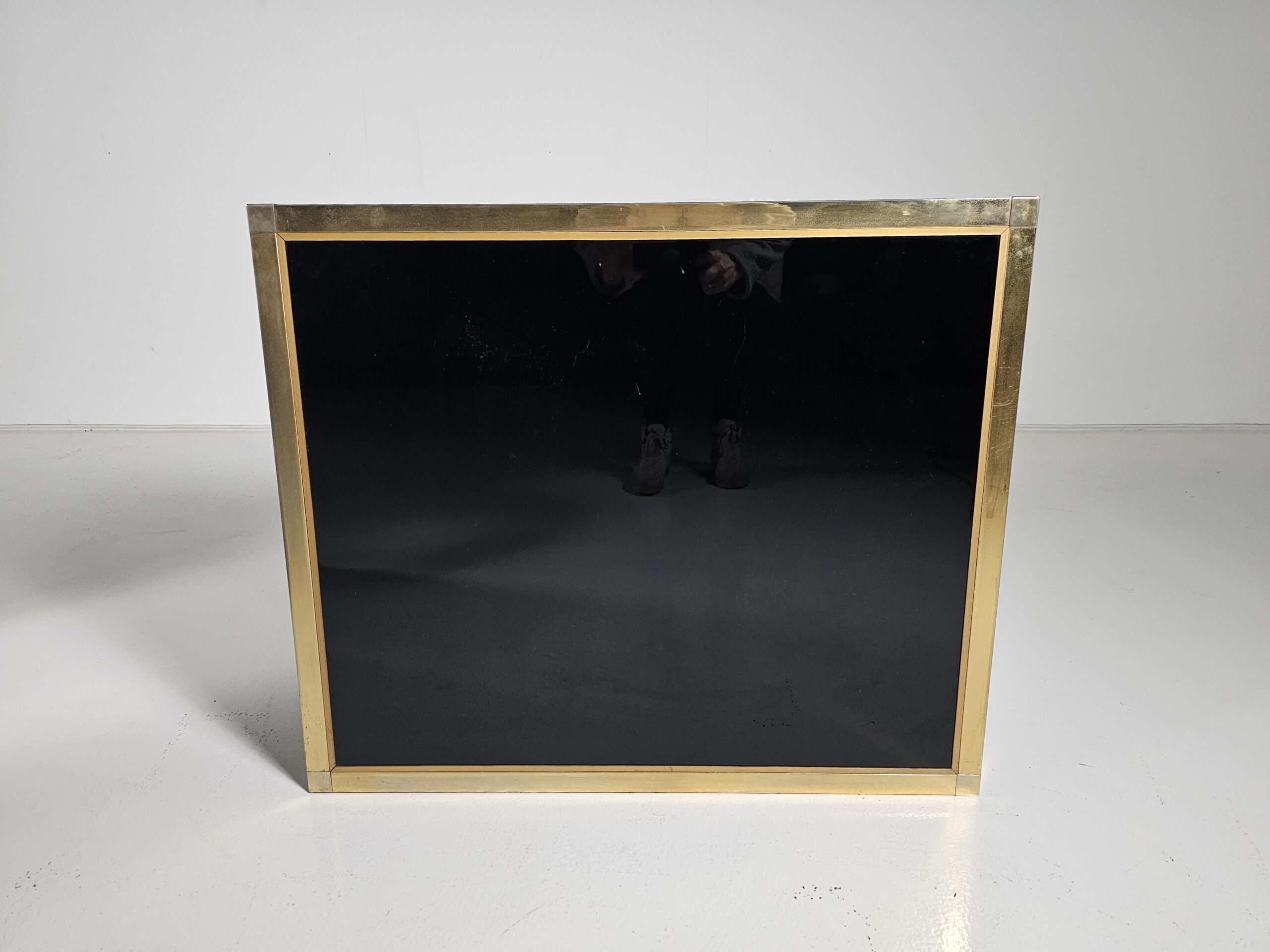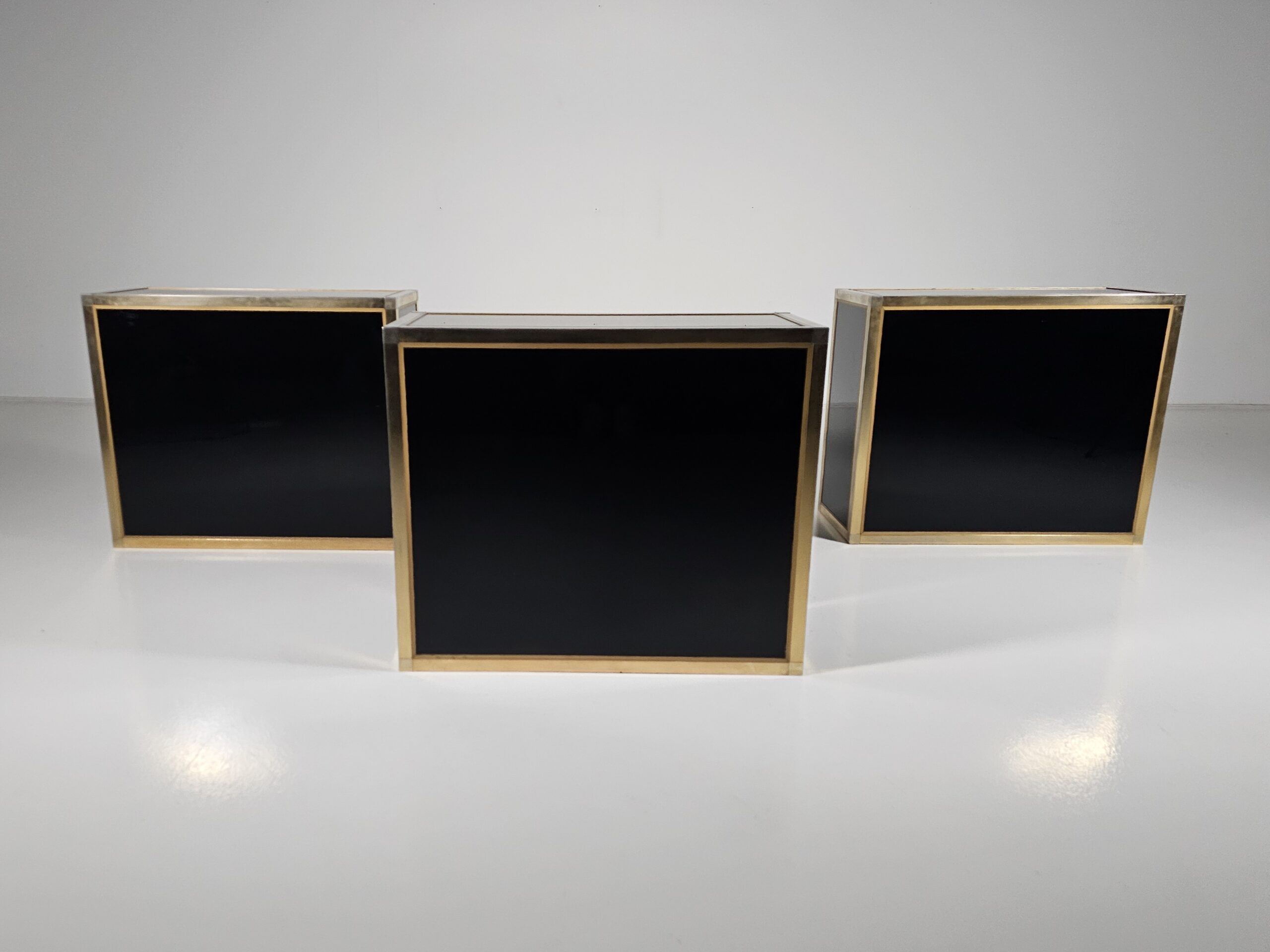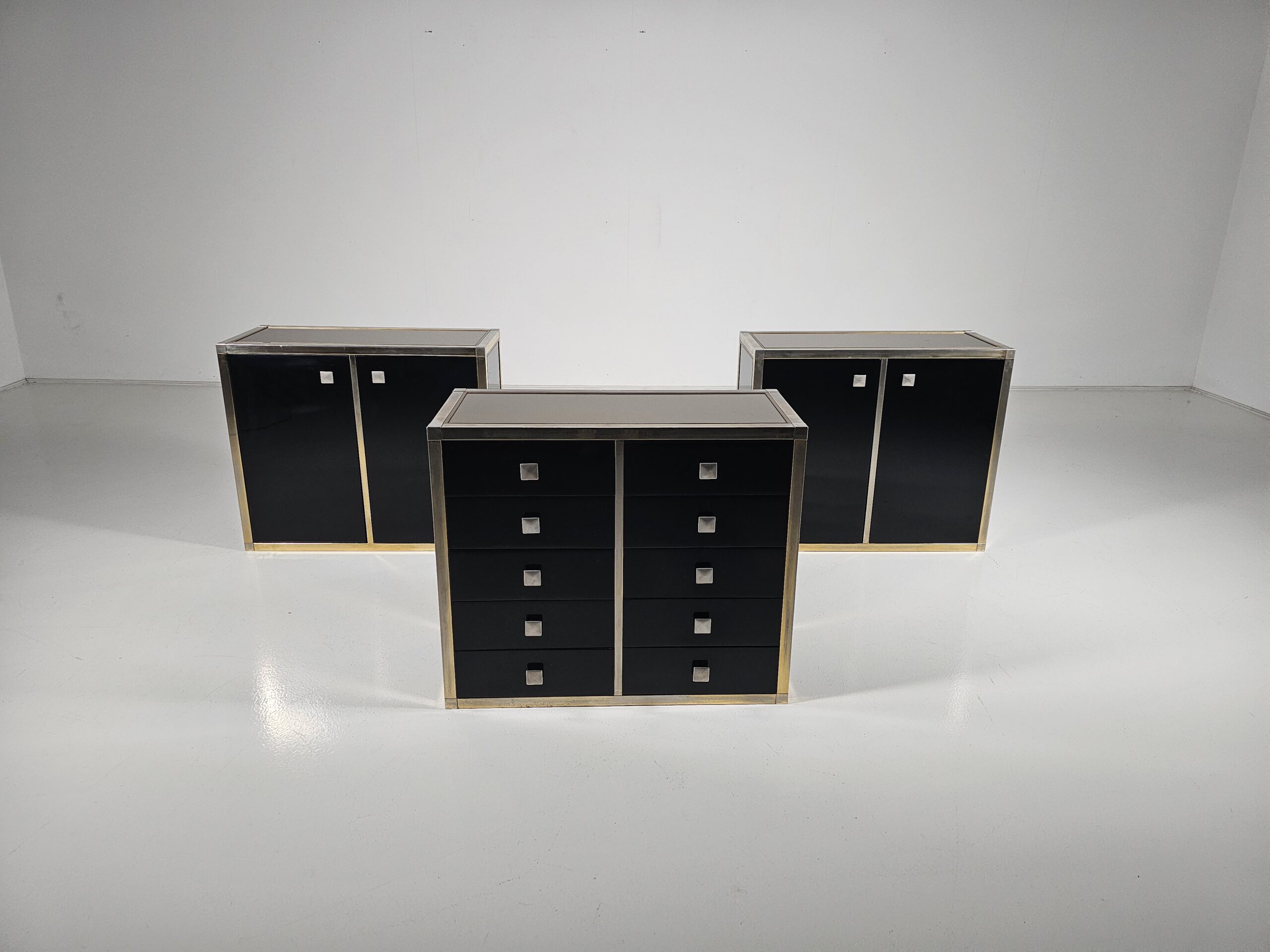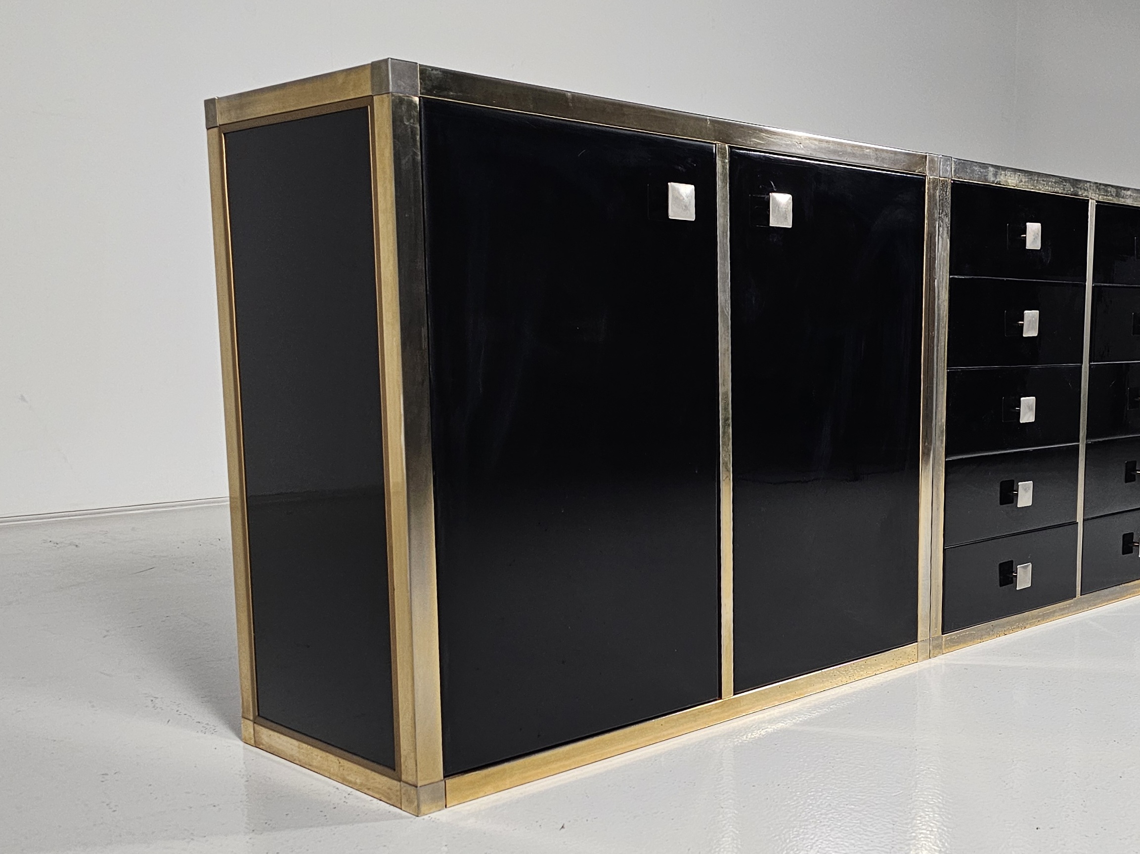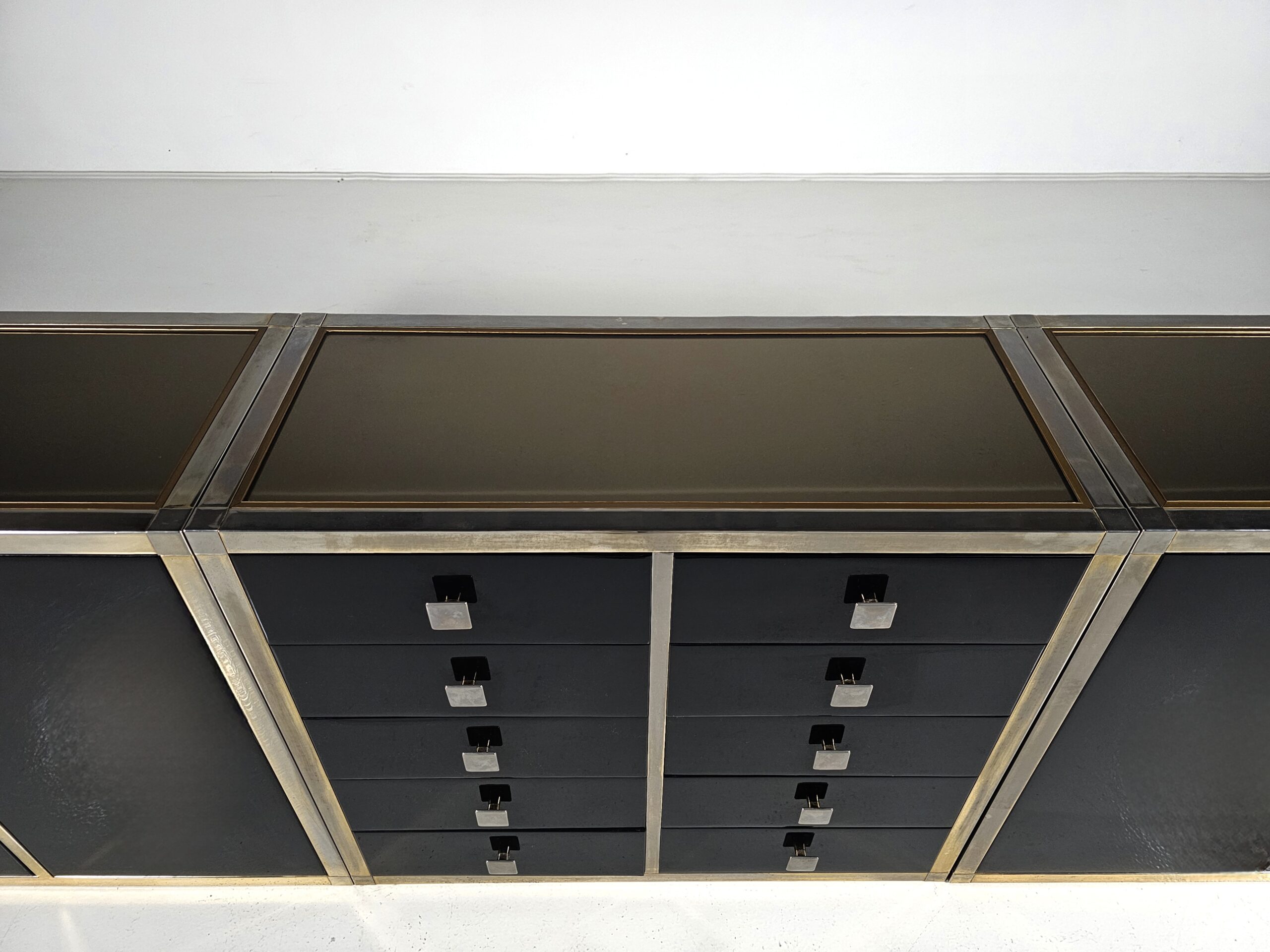 Stunning sideboard designed by Renato Zevi in the 1970s. It can also be separated to make smaller cabinets and a chest of drawers. Each element has a brass framing, black laminated panels, fronts, and opal glass tops. The handles and hinges are made of brass/chrome.