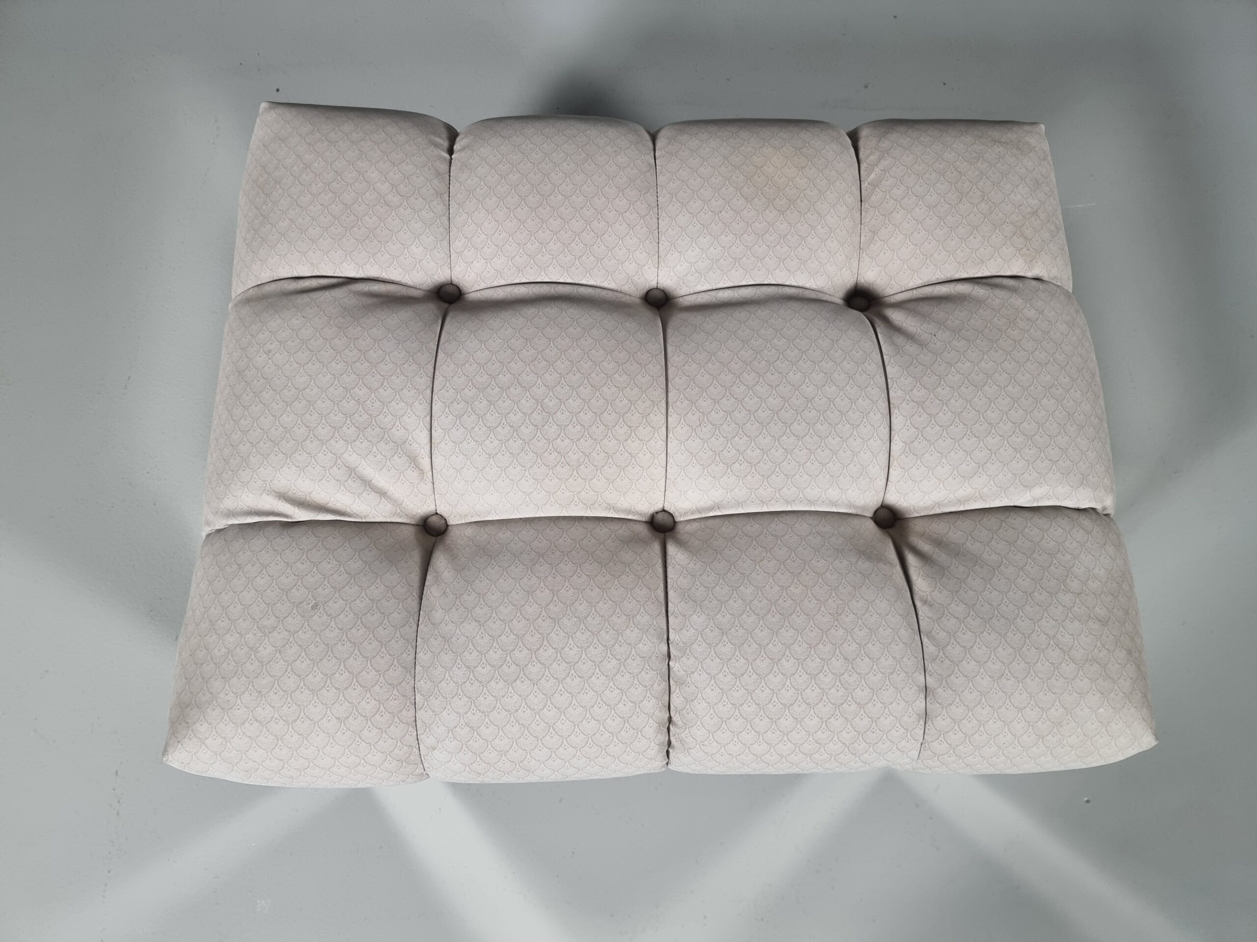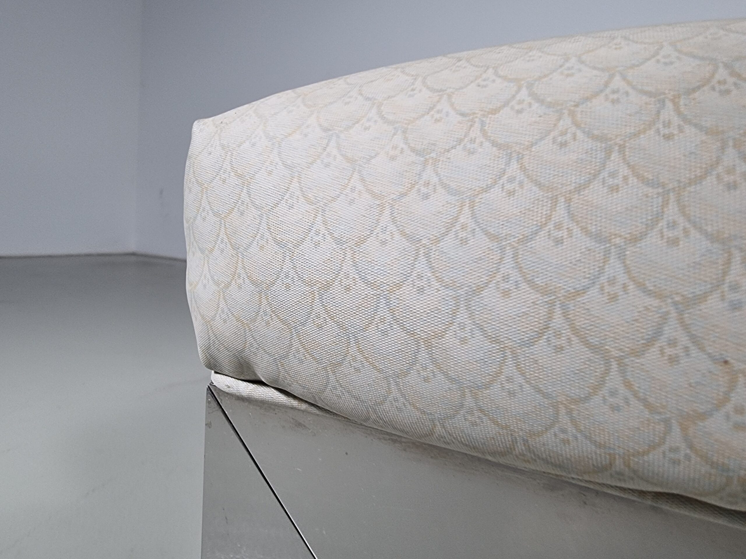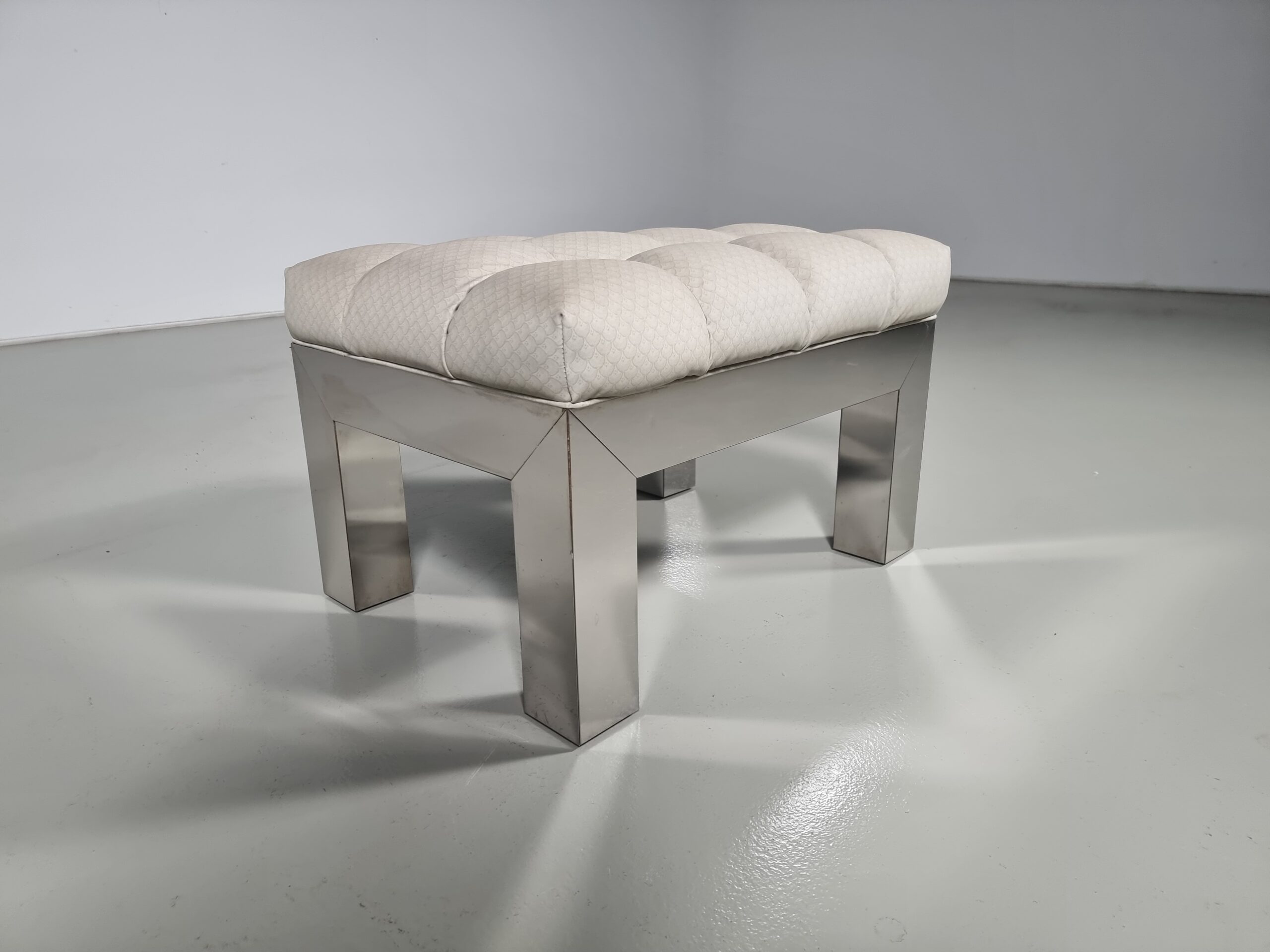 A Paul Evans ottoman/stool in classic chromed steel veneer. The Cityscape line was designed and produced by the Evans Studio in New Hope. It still has the original upholstery. On request, we can reupholster in a fabric of choice.