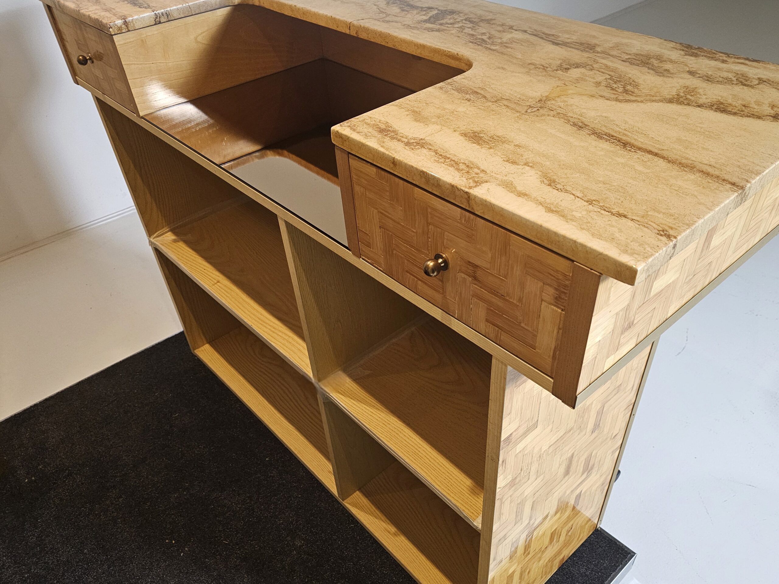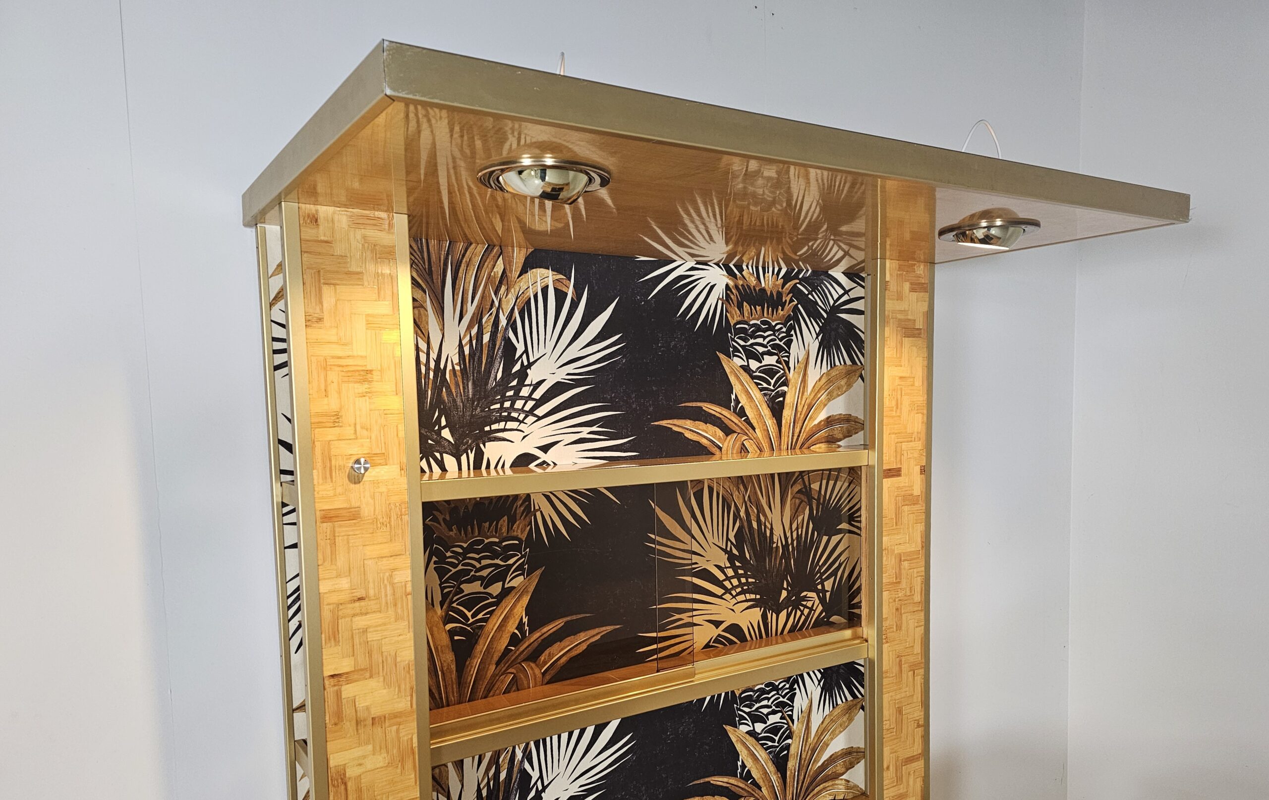 Unique Hollywood Regency cocktail bar. The counter contains two doors, 2 drawers and shelfs. The back has shelves and smoked glass sliding doors. It stands on a carpet base. Stunning original marble counter top! It also has 2 brass lamps in the ceiling.
