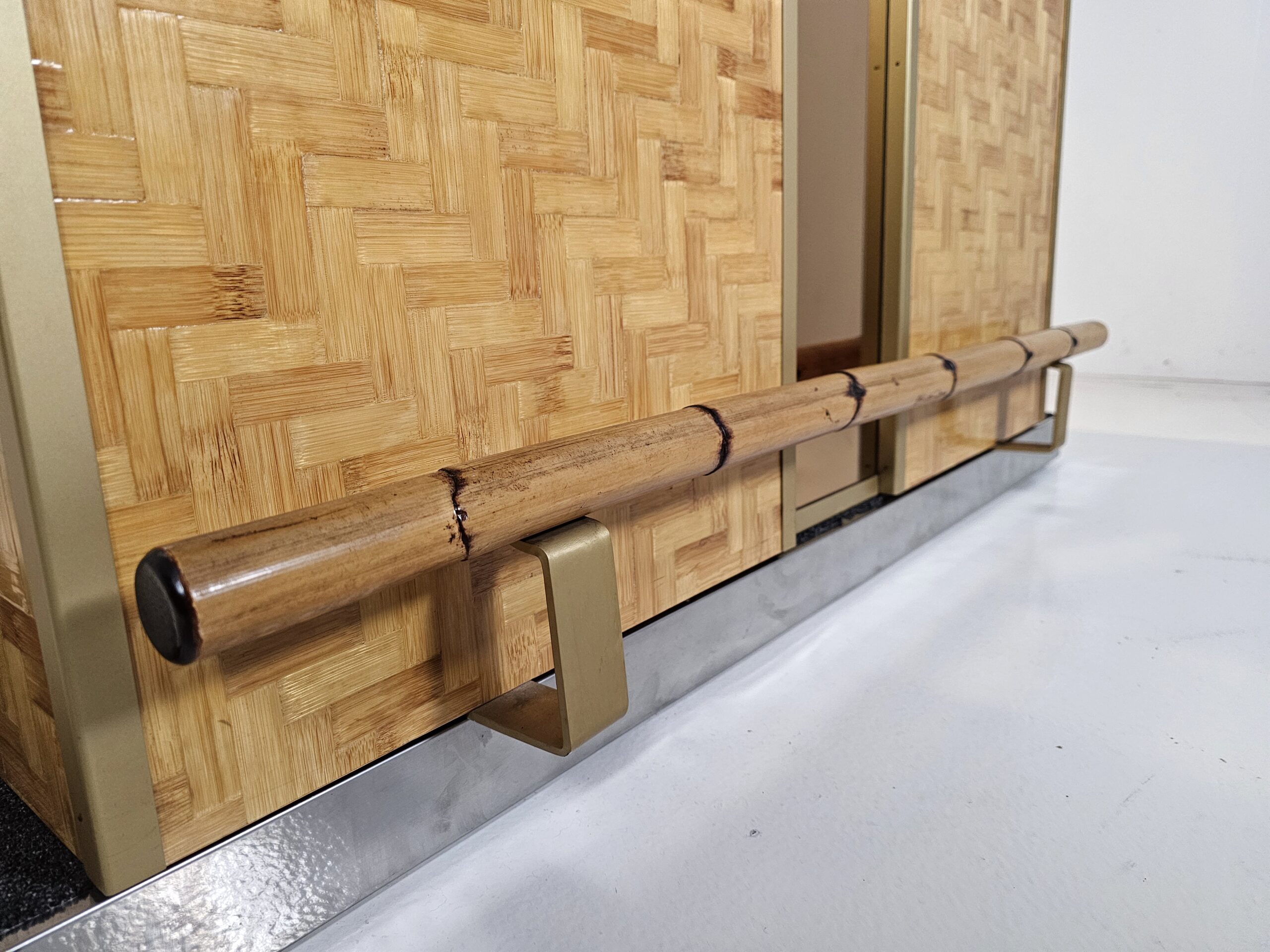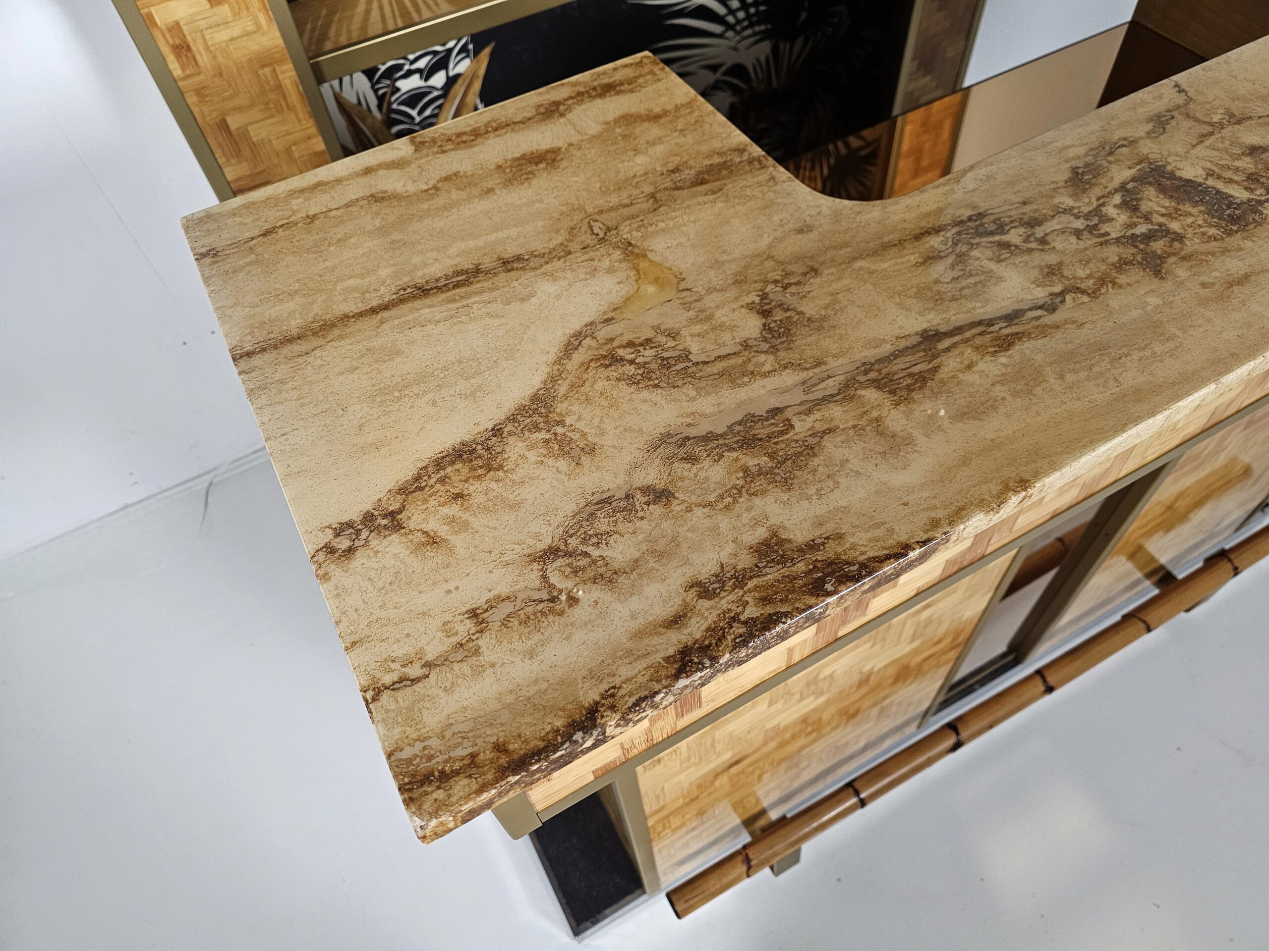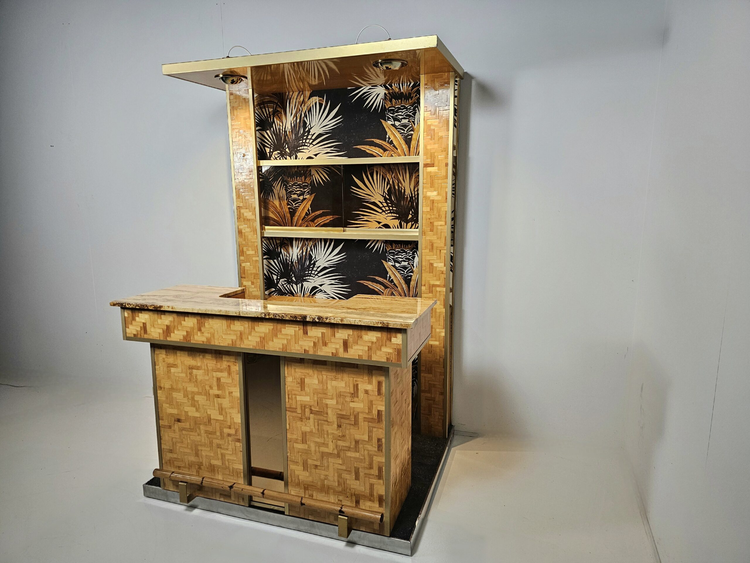 Cocktail bar with bar stools, brass, pressed bamboo, smoked mirrored glass, and marble, Italy, 1970s