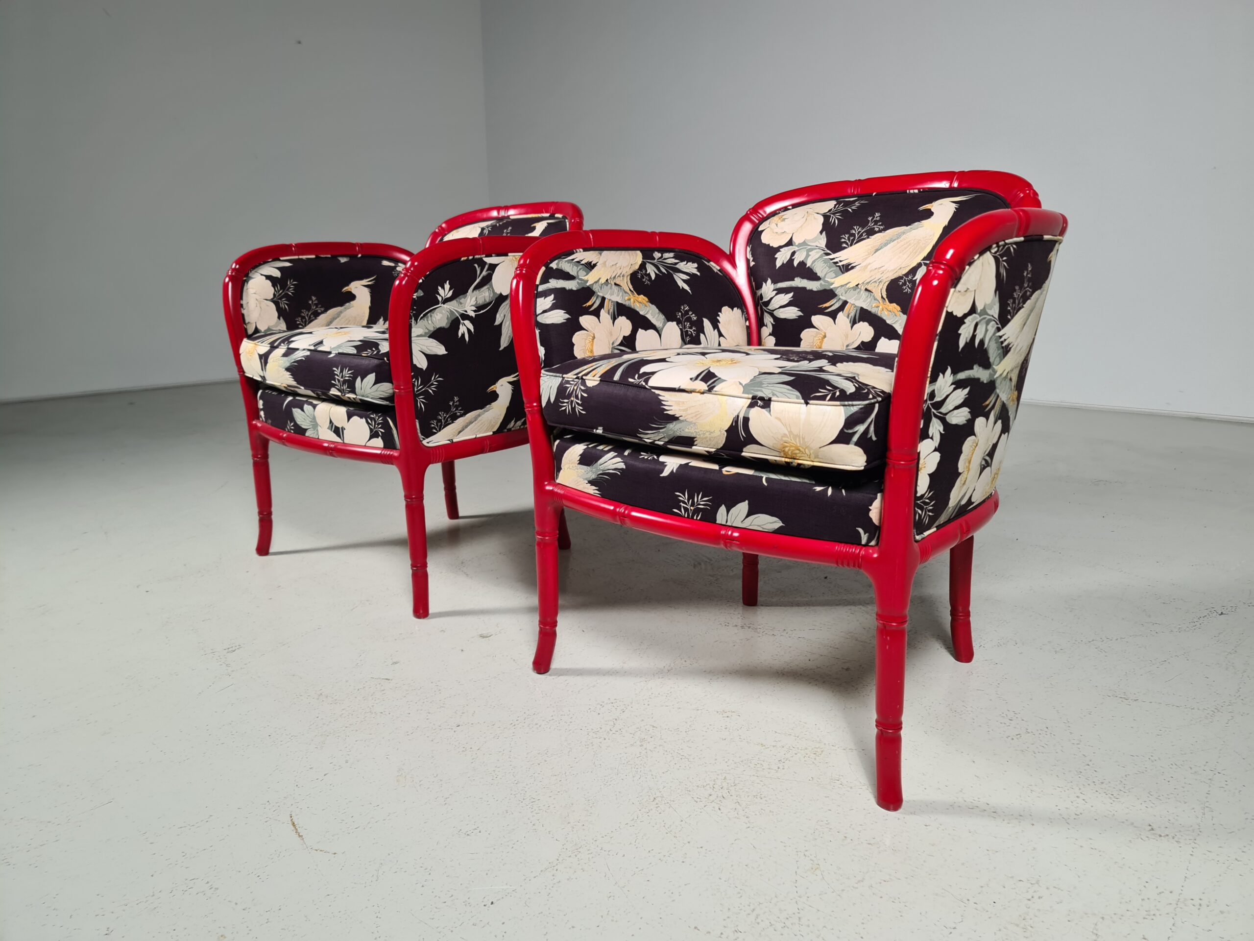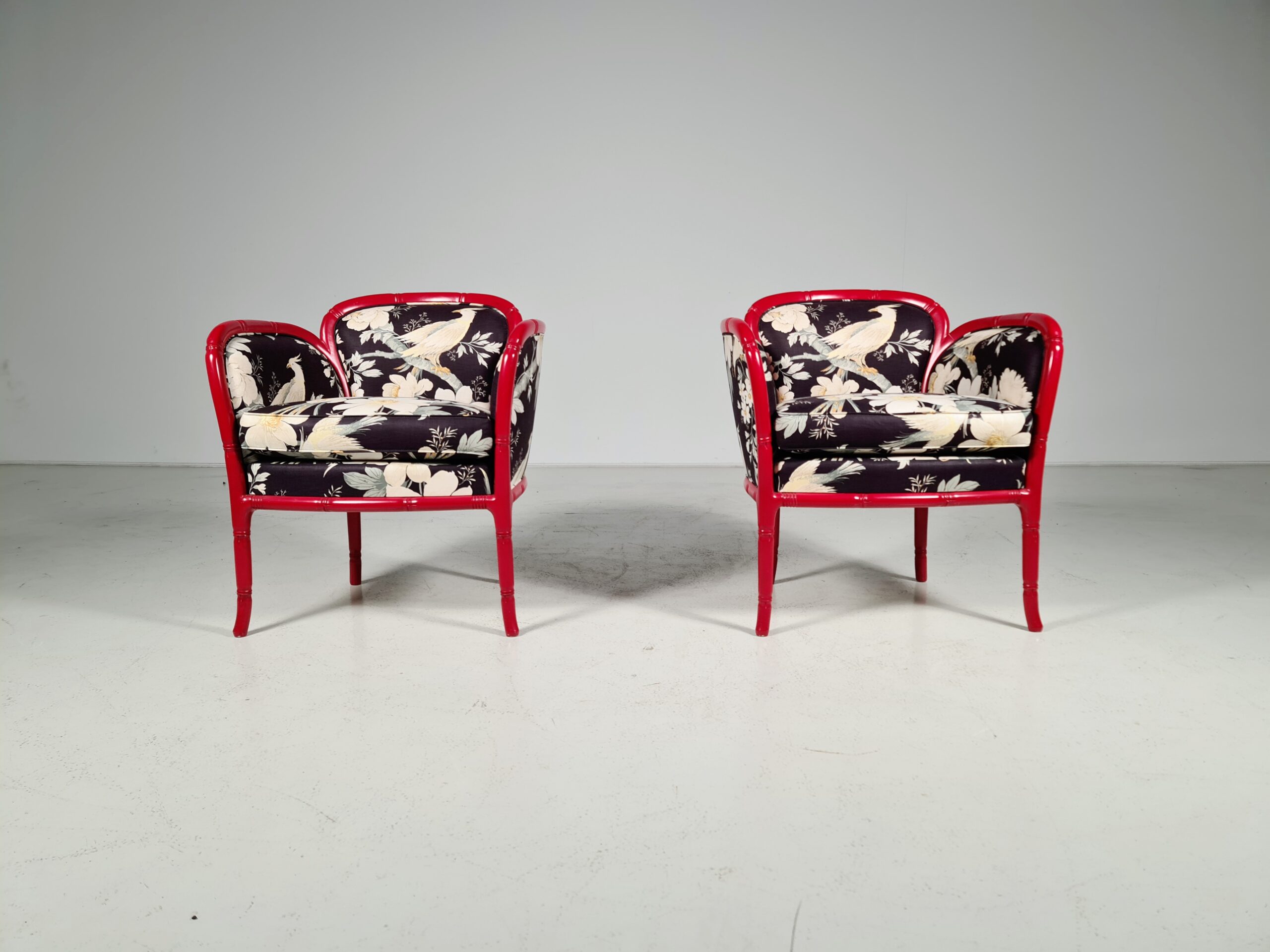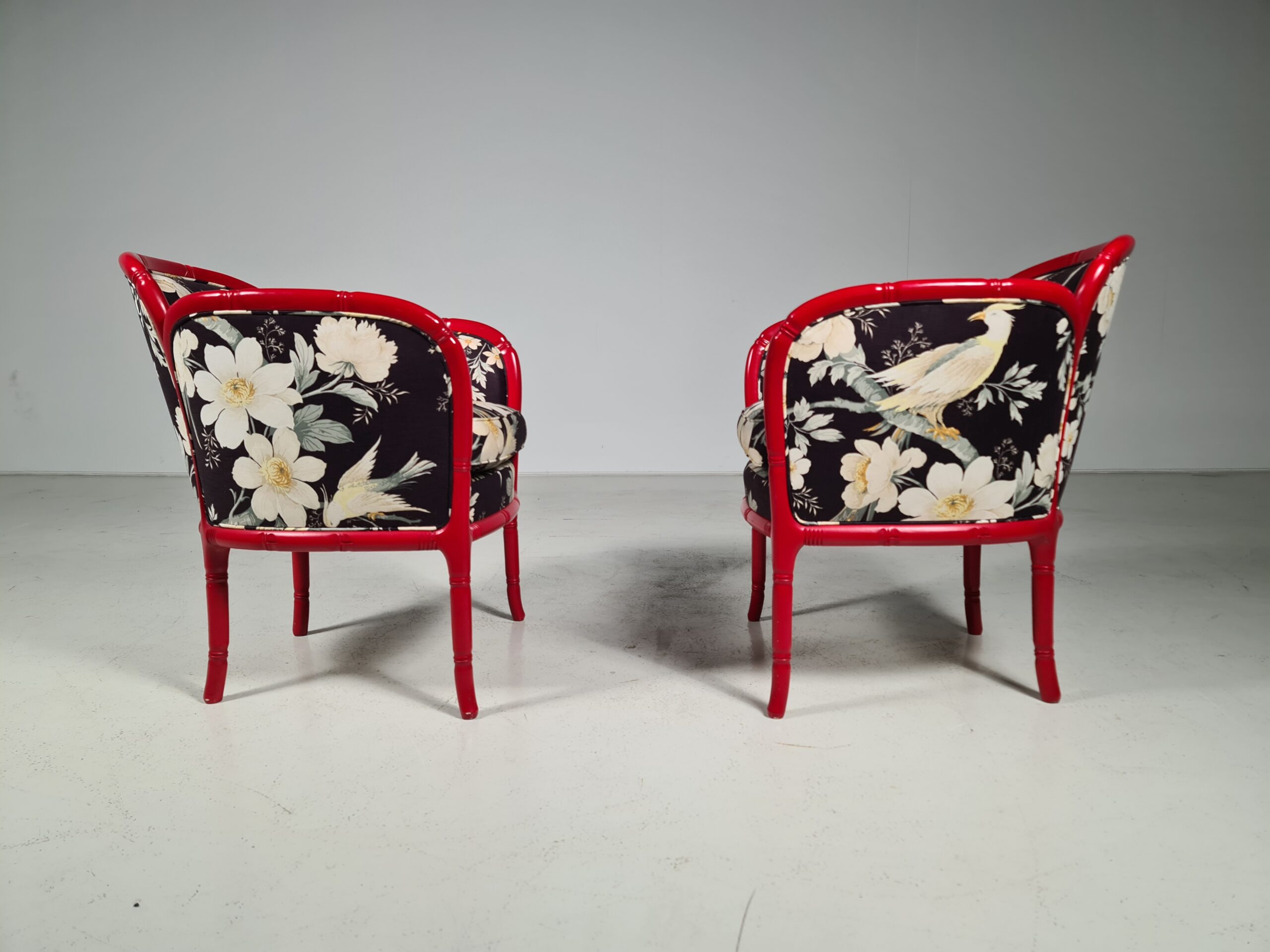 Set of 2 Hollywood Regency Style Faux Bamboo club chairs with high-quality oriental fabric from the 1960s.