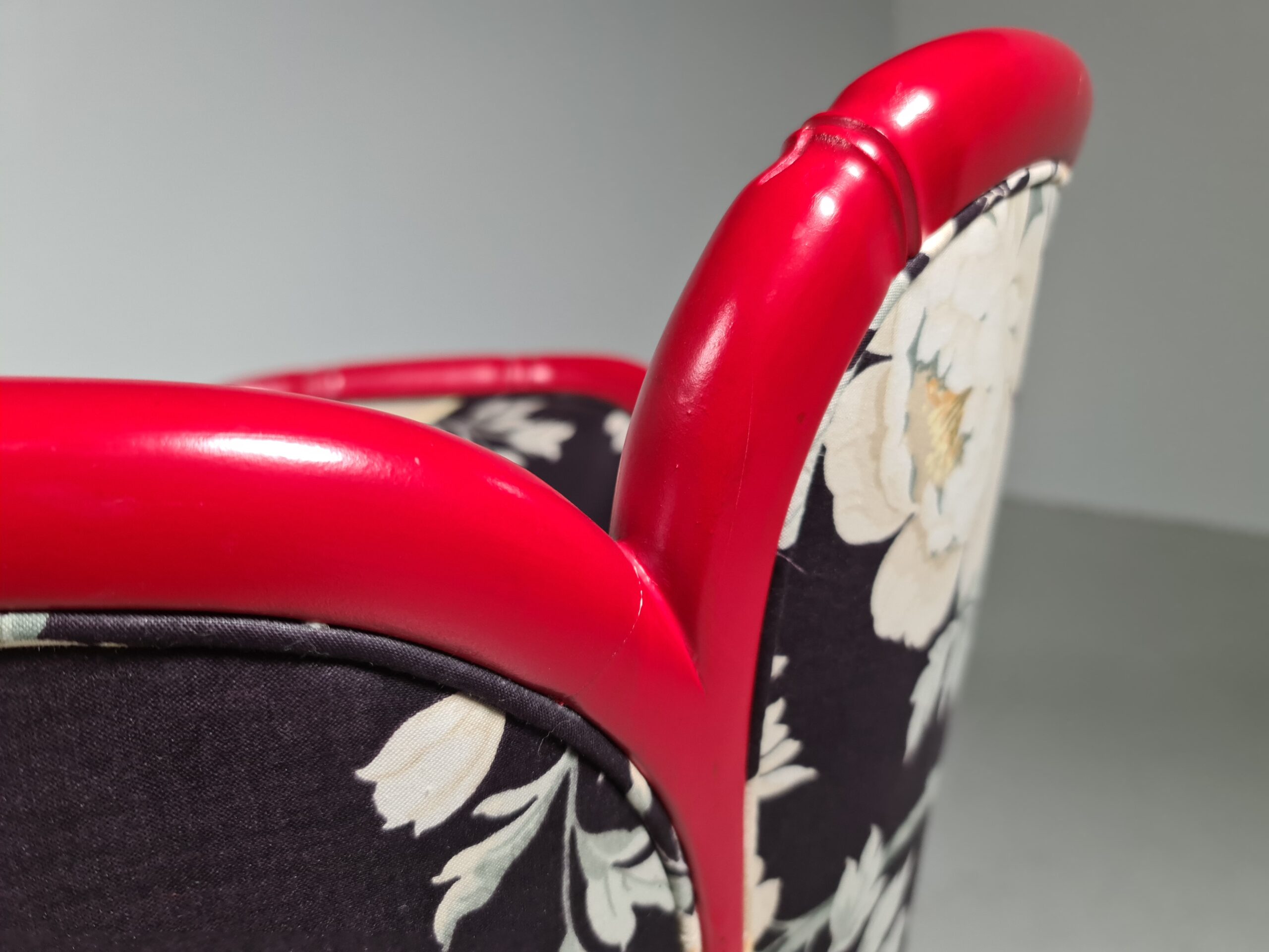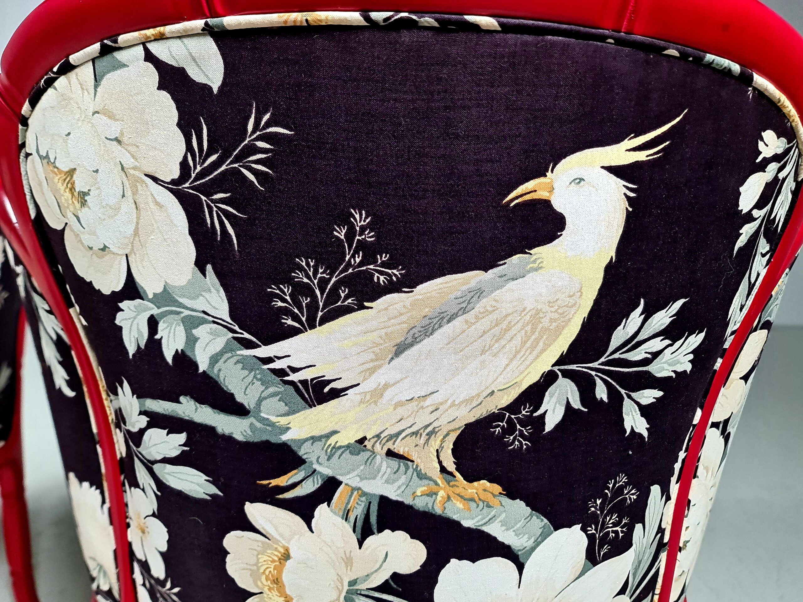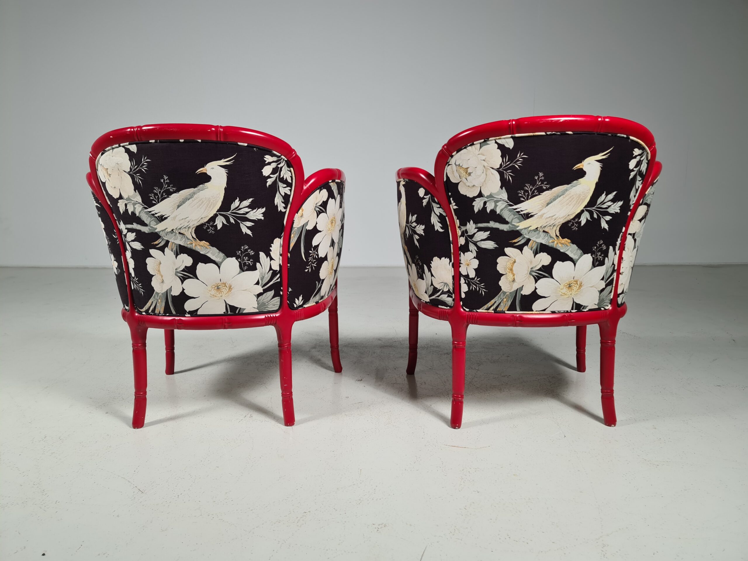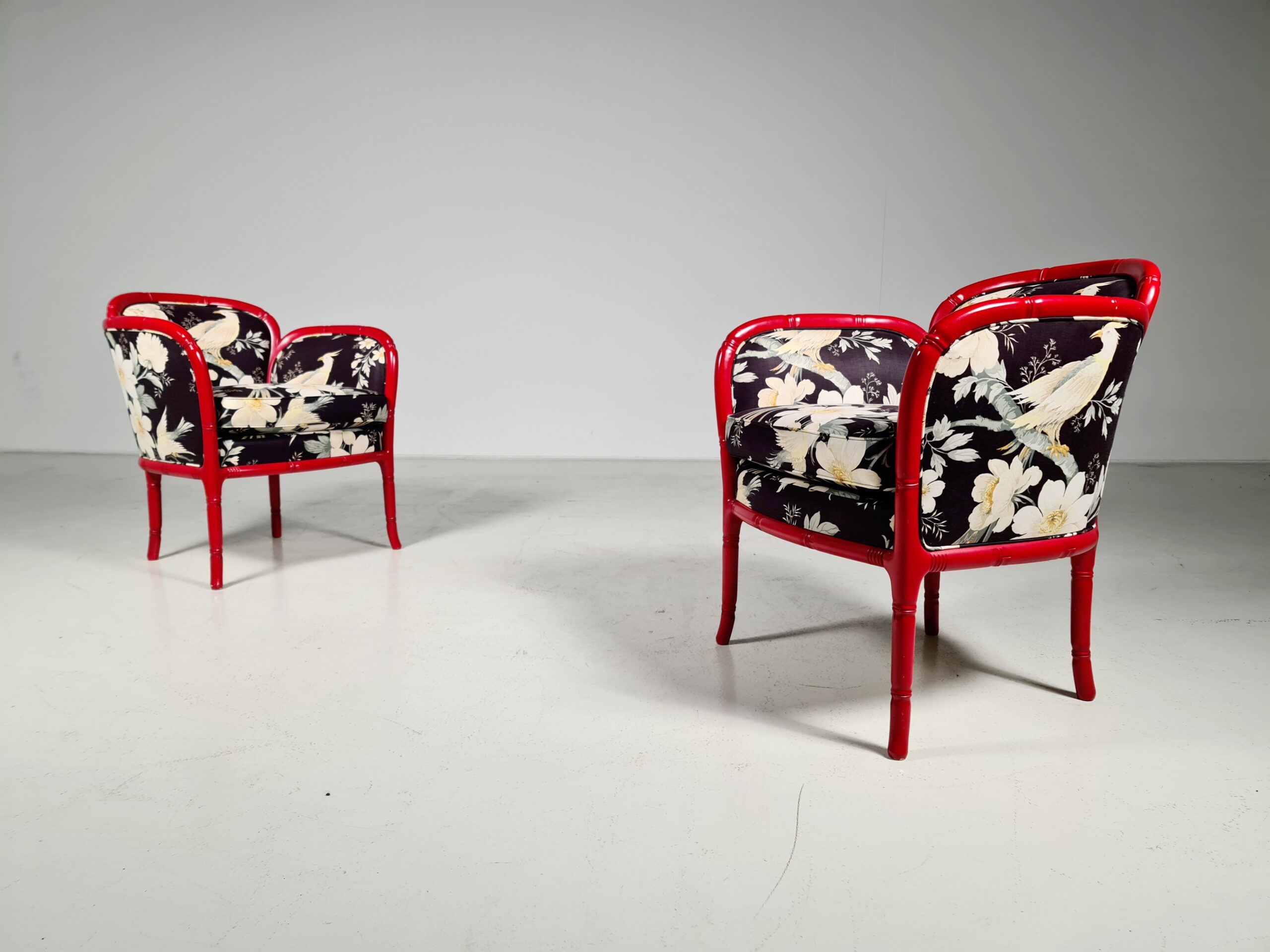 Set of 2 Hollywood Regency Style Faux Bamboo club chairs with high-quality oriental fabric from the 1960s.