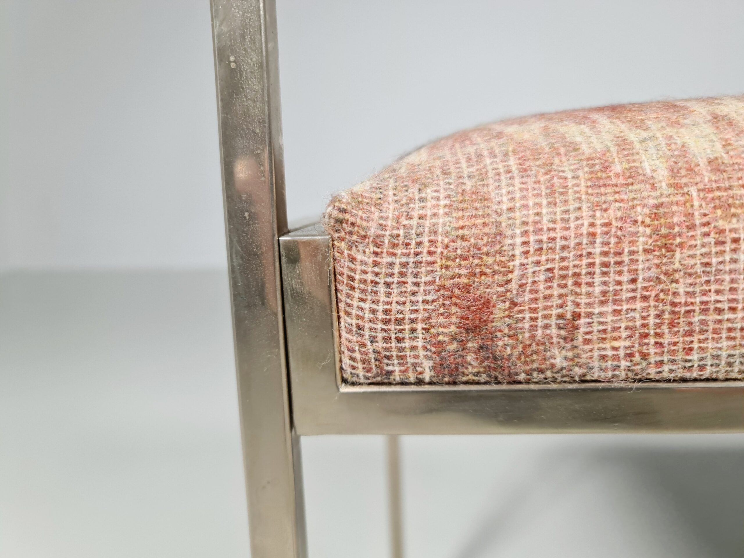 In a very good vintage condition. Wear consistent with age and use. Some marks on the base. Reupholstered in a stunning fabric by Zinc Textile.
